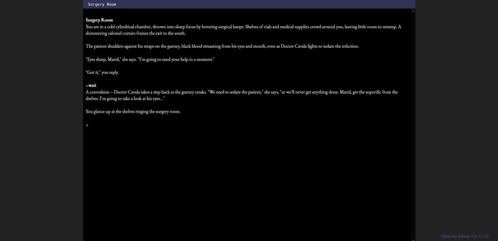 Not much to report this week. I wrote two scenes, did an editing pass on some of the middle parts of Day Three, and finished a mockup of what the final UI could look like.