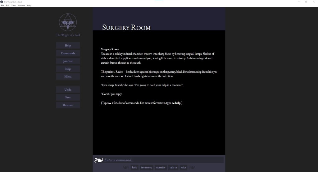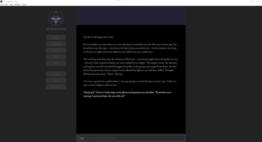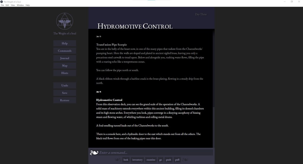 The command prompt now looks like a graphical control panel instead of a command line, and animates prominently whenever the player is expected to enter a command. There’s placeholder text to help new players who haven’t played parser text adventures before (“Enter a command…” and “Press any key to continue…” offering pointers on how the player is expected to interact with the game).