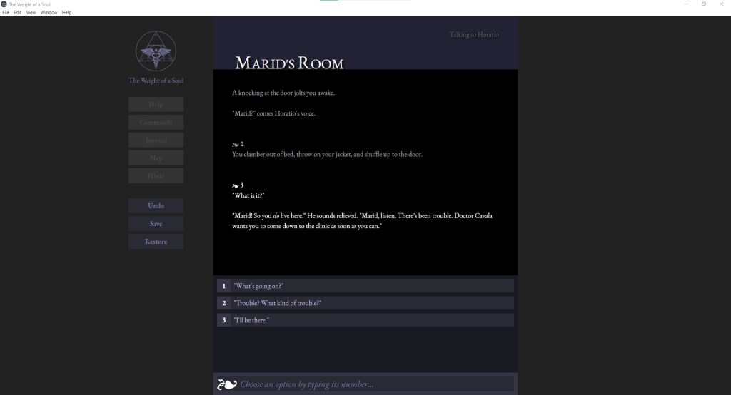 Some new The Weight of a Soul-related things: I finished the dialogue UI, and the premium version of the game now puts up nice clickable dialogue options instead of the text-based command prompt. Here’s what it looks like: